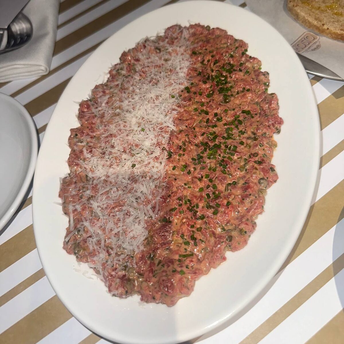 Новое место Mosto La caffeteria от Lucky group на Большой Никитской на месте вкусного, но вечно пустого ресторана «345», «Гвоздик» удивило. Аскетичное меню, в котором только классика с итальянскими акцентами, витрина с десертами, меню с завтраками — налицо конкурент легендарной «Кофемании» через дорогу. И бренд-шефу Эмануэле Поллини шалость удалась! Тортеллини болоньезе с мясным бульоном однозначно хороши, хотя эта позиция в меню редко бывает удачной. Тартар в классическом французском стиле, жирный и гармоничный, с ломтем хлеба идеально. А вот пицца по московским меркам странновата — тонкая, без хрупких бортиков и с вываливающейся начинкой. Паста с лимоном и креветками прямо ощутимо «аль денте», даже немного слишком. Десерты? Классические сицилийские канноли с рикоттой пресноваты. Но очень обрадовали маленькие смешные песочные корзиночки с фруктами. Сразу вспоминаешь детство, как ел их в детстве после музыкальной школы. Тартар из говядины, пармезан — 1400 р. Тортеллини болоньезе, мя
