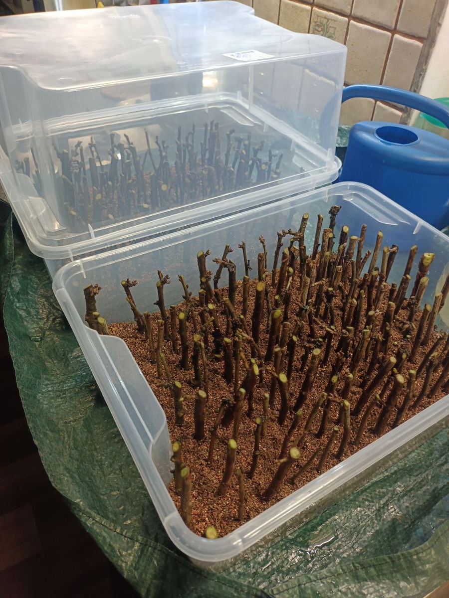 Накрываю пустым контейнером и получаю парничок. Можно было конечно использовать стреч-плёнку, но пока пусть так постоят. Всего получилось 250 веточек красной смородины «Натали». Ух... А ещё ждёт красная Jonkheer Van Tets, и три сорта чёрной смородины.