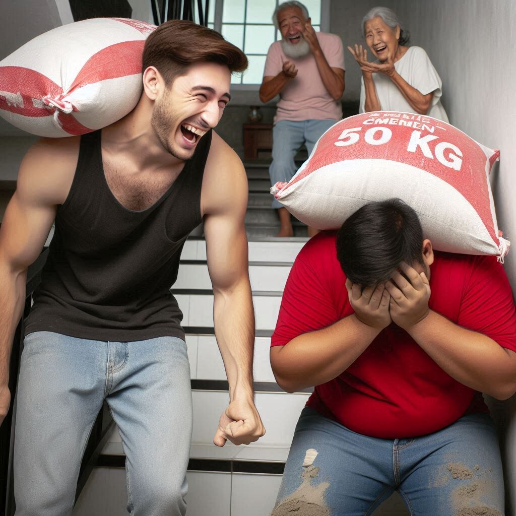 И правда, жадность к заработку с тяжёлой работой не смогла победить внутреннюю борьбу с физической усталостью. Сменщики были найдены, и процесс пошёл дальше. Но даже с новой командой дело двигалось медленно — вес мешков и крутая лестница стали настоящими противниками.