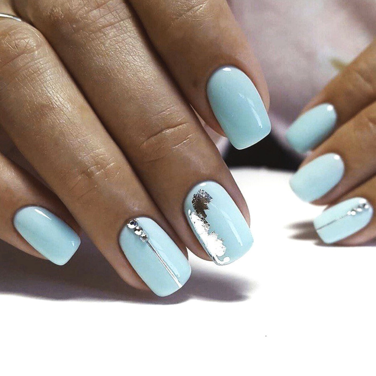 Представь: мягкий пастельный голубой оттенок, как небо перед дождём. А на нём — кусочки серебристой фольги и аккуратные блестящие линии. Добавим пару страз — и маникюр будто из журнала. Особенно красиво это смотрится на коротких ногтях, форме "мягкий квадрат" или овальчик.