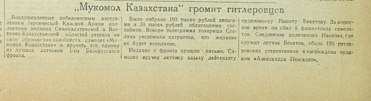 В этот день, 7 апреля 1945 года, газета «Казахстанская правда» на первой полосе газеты напечатала заметку о замечательном поступке работников мельниц Семипалатинской и Восточно-Казахстанской областей, собравших личные средства на покупку самолёта для казахстанца, лётчика орденоносца Рашита Бекетова Воодушевлённые победоносным наступлением героической Красной Армии коллективы мельниц Семипалатинской и Восточно-Казахстанской областей решили на свои сбережения приобрести самолет «Мукомол Казахстана» и вручить его одному из лучших лётчиков 1-го Белорусского фронта. Было собрано 100 тысяч рублей деньгами и 30 тысяч облигациями госзаймов. Вскоре телеграмма товарища Сталина уведомила патриотов, что желание их будет исполнено. Недавно с фронта пришло письмо. Самолёт вручен лётчику казаху лейтенанту орденоносцу Рашиту Бекетову. За короткое время он сбил 5 фашистских самолётов. Соединение полковника Иванова, где служит лётчик Бекетов, сбило 190 гитлеровских стервятников и награждено орденом «Але