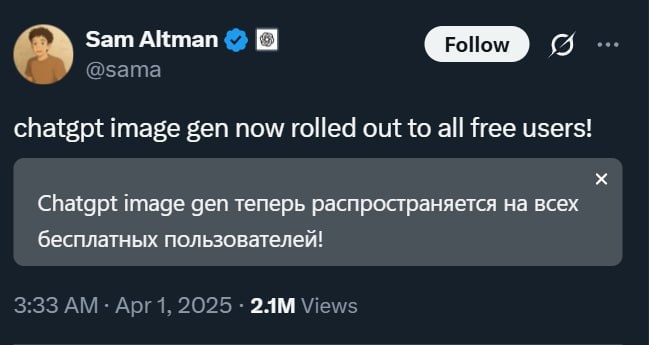 ⚡️ ТЕПЕРЬ БЕСПЛАТНО! ХАЙПОВЫЙ ГЕНЕРАТОР КАРТИНОК GPT-4O ДОСТУПЕН ВСЕМ Сэм Альтман официально объявил: GPT-4o теперь доступен даже без платной подписки. Да, это реально, и это не шутка! Мы проверили на бесплатной версии — всё работает как часы. 🚀 Что это значит для тебя? Теперь ты можешь создавать крутые визуалы без лишних затрат. Просто зайди на chatgpt.com и тестируй. Жми 🔥, если эта новость тебя вдохновила! #GPT4o | ВСЁ ПРО AI | AI NEWS | Дзен | ОК