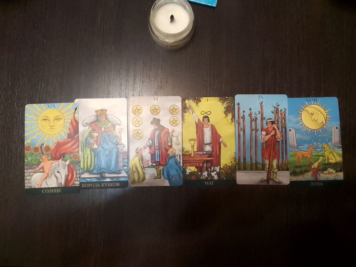 Ну или вот ещё один из моих ярких примеров итогового счета 0-0, когда присутствуют ☀️ и 🌒 в раскладе. Тут я тоже обратил внимание на символизм карт тех что рядом, 6 пентаклей как некоторое равенство (изображённые весы на карте) и Маг, моя одна из самых любимых карт с символом бесконечности над головой. 9 жезлов и король кубков для меня уже были на третьем плане тогда, я четко определил тут счёт 0-0 и как оказалось верно!