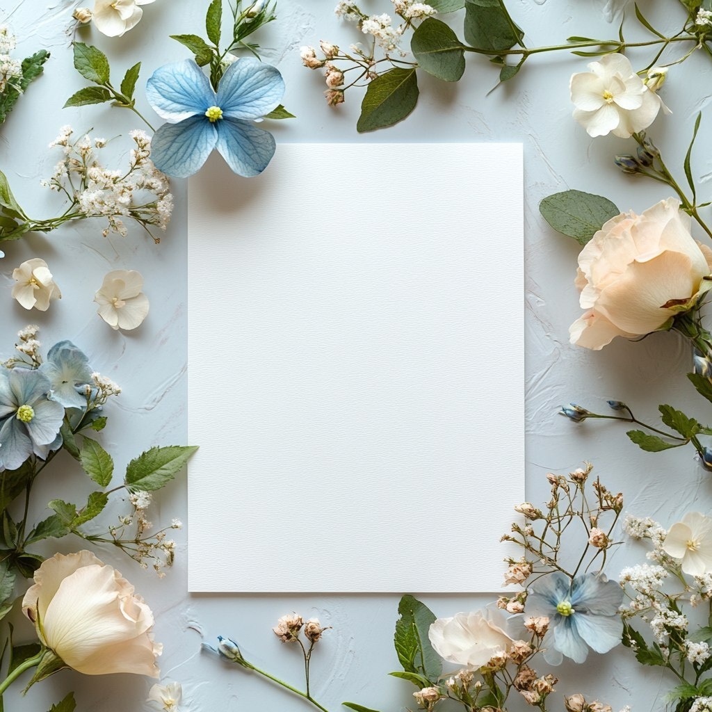 Создано на основе запроса: a neutral coloured mock up for an invitation delicate blue and beige flowers around the blank white invite