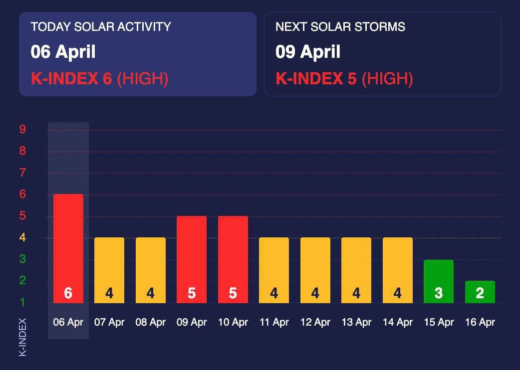 Магнитная буря в 6 баллов вчера пришла Землю: девять дней подряд население планеты страдать от ее влияния Пики удара по здоровью – 6, 9 и 10 апреля. В другие дни мощность упадет до 4 баллов. Возможны сбои в работе средств связи. У метеозависимых – частые мигрени, резкие перепады давления и настроения.