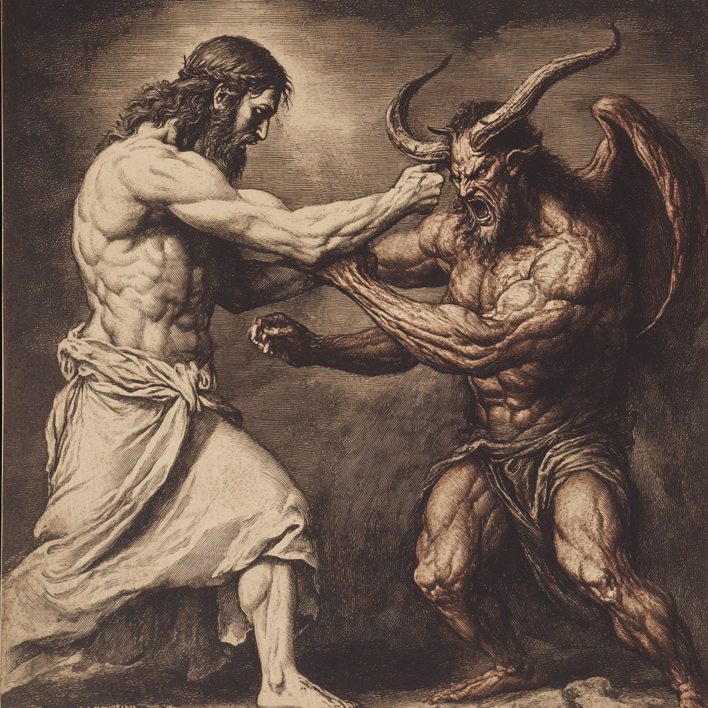 Создано на основе запроса: Jesus Christ performing a Sumi-otoshi Judo technique on the devil, high renaissance style