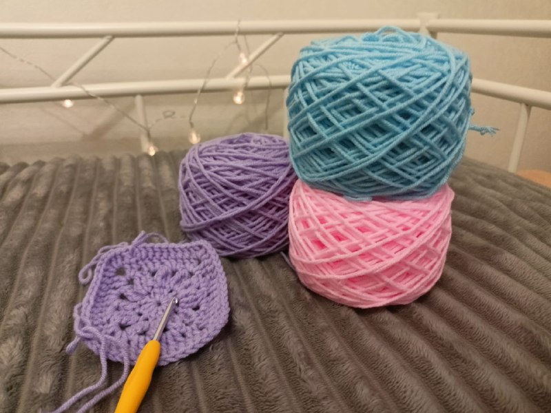 Одним февральским снежным днем, когда было очень холодно, мне пришла идея связать плед. За все мои вязальные годы я его еще никогда не вязала. А любой человек, связанный с пряжей, все-таки должен к этому прийти. Вот я и пришла. Сначала я хотела сделать его из определенных цветов. Тут выбор пал на розовый и сиреневый цвета. Почему розовый и сиреневый? Захотелось чего-то закатного, чего-то яркого, потому что я уже соскучилась по весне. Вот представьте - апрель... Вечереет, появляется зеленая трава, дует еще прохладный ветерок. На небе переливы самых разнообразных цветов: голубой, красный, желтый, розовый и сиреневый. И чувствуется этот весенний воздух, хочется вдохнуть его как можно глубже... Я отвлеклась... Так вот Учитывая, какое большое количество пряжи может мне понадобиться, я использовала обычную Adelia HAPPY 100% акрил 50г/128м и крючок 3.5 мм. И вот так, за просмотром сериалов по вечерам, я вязала квадратик за квадратиком. Схему для цветочных квадратов можно взять здесь: https:/