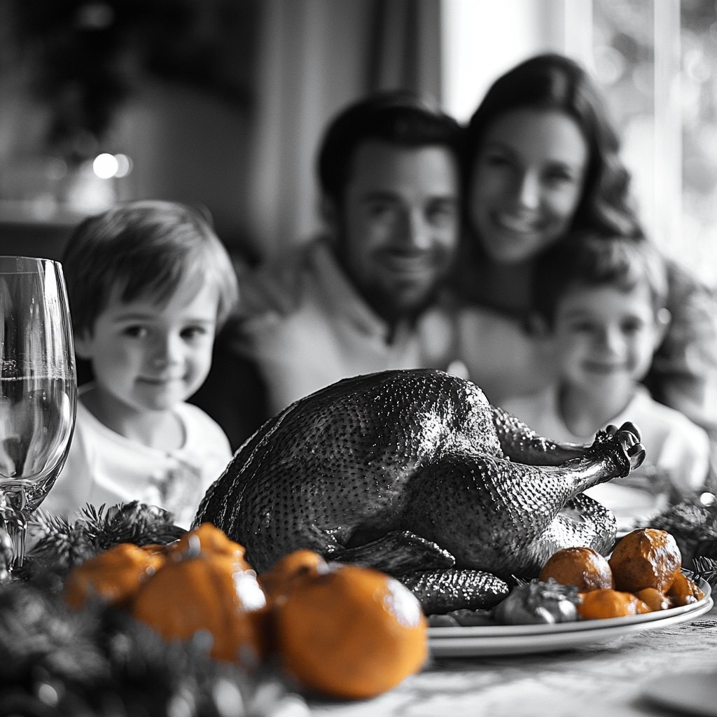 Создано на основе запроса: Happy family together at the table for a festive lunch, food is visible, such as a crisp and shiny duck. It is in focus throughout the image...the background is blurredReal black and white photography --- Автоперевод: Счастливая семья вместе за столом для праздничного обеда, виденная еда, такая как четкая и блестящая утка. Неплохо вышло? 🤔 https://dzen.ru/id/65c0c65c86e4f837c27b24d7 #ИИ #AI #нейросеть #midjourney #art