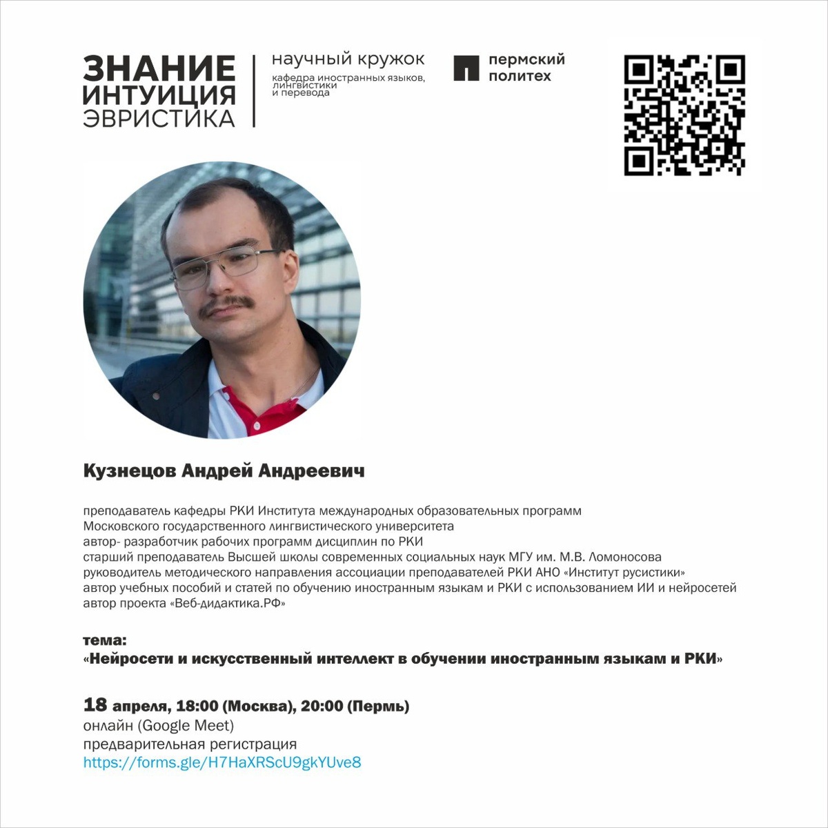 Уважаемые коллеги! По приглашению руководителя научного кружка "Знание. Эвристика. Интуиция" Юлии Швецовой 18 апреля расскажу об ИИ и нейросетях в обучении иностранным языкам (в том числе РКИ) и переводу. Расскажу об их возможностях как для преподавателей, так и для их студентов, а также представлю наше коллективное пособие "Цифровые технологии в педагогической деятельности" и авторскую классификацию нейросетей. Буду рад ответить на Ваши вопросы. Регистрация на мероприятие по ссылке: https://docs.google.com/forms/d/e/1FAIpQLSeGnSKn3m4d5Zc5OgMThtNpQp0e9hqZZXKVx35k9JT7YIzbaQ/viewform Буду рад видеть друзей и коллег.