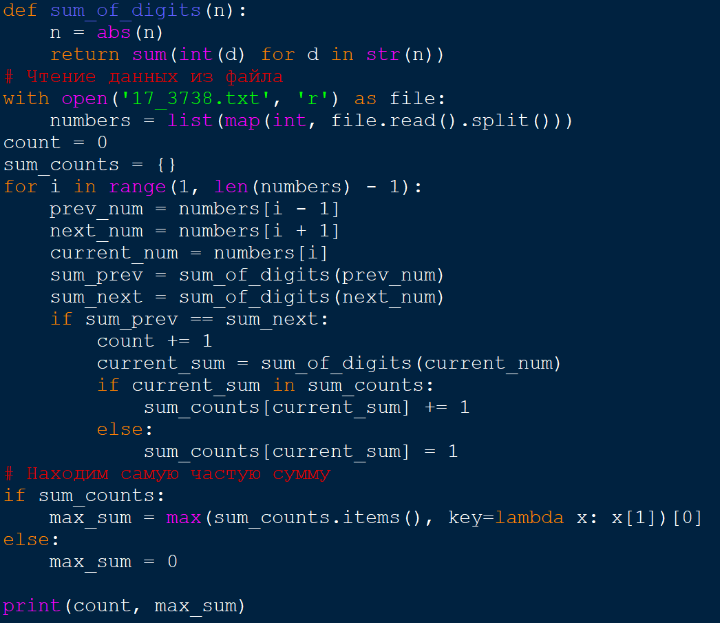 В файле содержится последовательность натуральных чисел. Элементы последовательности могут принимать целые значения, по модулю не превосходящие 10 000 включительно. Определите количество чисел этой последовательности таких, что предыдущее и следующее число для них имеют одинаковую сумму цифр. В ответе запишите количество найденных чисел, затем самую часто встречающуюся сумму разрядов среди найденных чисел. В данной задаче под парой подразумевается два идущих подряд элемента последовательности. Не забывайте подписываться на канал! Таким образом вы помогаете выходу новых разборов! Решение: Если вам понравился разбор - можете поддержать автора с помощью функции "доната". Спасибо А также ставьте лайк, пишите комментарии. ЖМИ НА ССЫЛКУ СНИЗУ ДЛЯ НАВИГАЦИИ ПО РЕШЕНИЯМ Тут все разборы собраны воедино