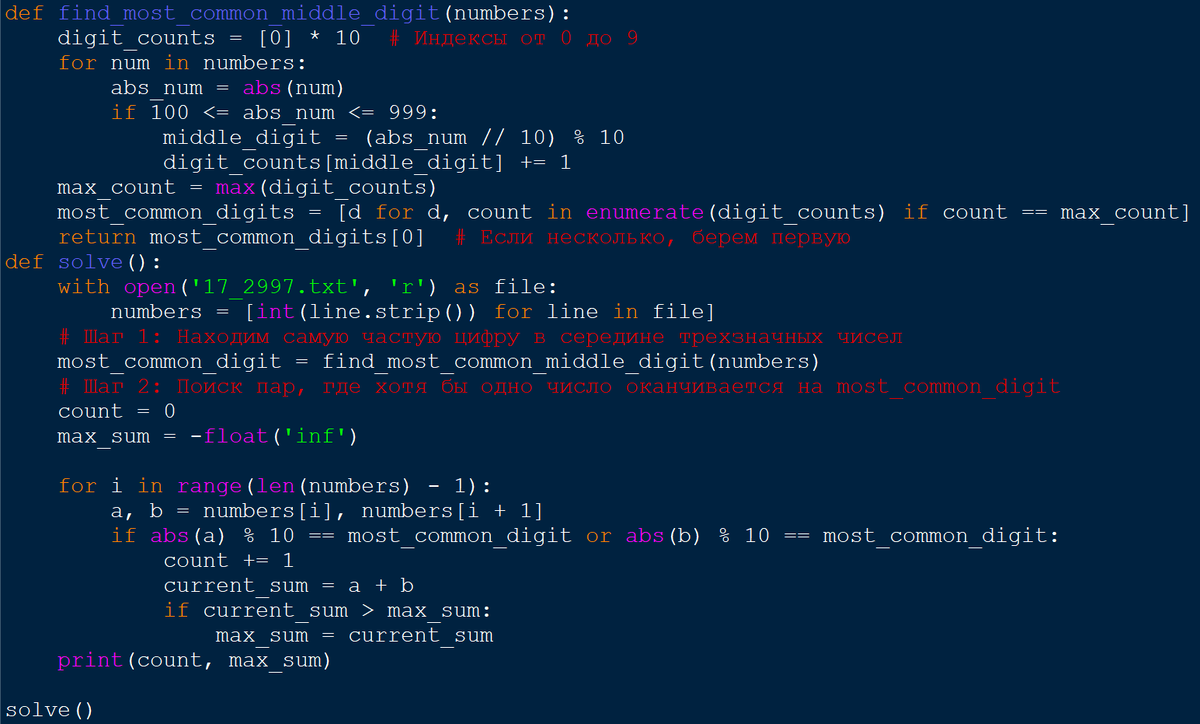 В файле содержится последовательность целых чисел. Элементы последовательности могут принимать целые значения от -10000 до 10 000 включительно. Определите пары, в которых хотя бы одно число оканчивается на цифру, которая чаще всего встречается в середине всех трехзначных чисел в файле (например, в середине числе -152 цифра 5). В ответе запишите два числа: сначала количество найденных пар, а затем – максимальную сумму элементов таких пар. В данной задаче под парой подразумевается два идущих подряд элемента последовательности. Не забывайте подписываться на канал! Таким образом вы помогаете выходу новых разборов! Решение: Объяснение: Если вам понравился разбор - можете поддержать автора с помощью функции "доната". Спасибо А также ставьте лайк, пишите комментарии. ЖМИ НА ССЫЛКУ СНИЗУ ДЛЯ НАВИГАЦИИ ПО РЕШЕНИЯМ Тут все разборы собраны воедино