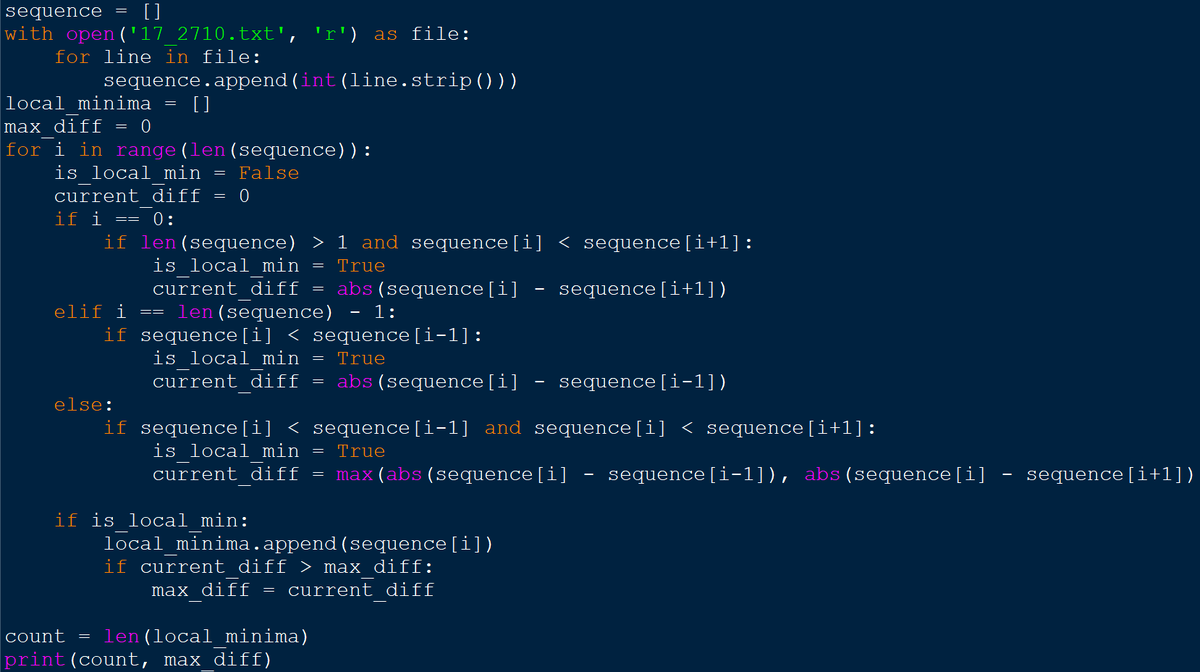 В файле содержится последовательность целых чисел. Элементы последовательности могут принимать значения от -1000 до 1000 включительно. Локальным минимумом будем называть элемент, который строго меньше соседа слева и справа (для первого элемента - только сосед справа, для последнего - только сосед слева). Определите количество локальных минимумов последовательности, а также максимальный модуль разности локального минимума с одним из соседних элементов. Например, для чисел 22 5 15 21 -7 -1 ответом будет пара чисел 2 28.