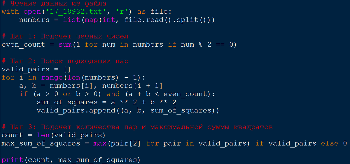 Для каждой подходящей пары вычислим сумму квадратов её элементов. - Подсчет количества подходящих пар и нахождение максимальной суммы квадратов: