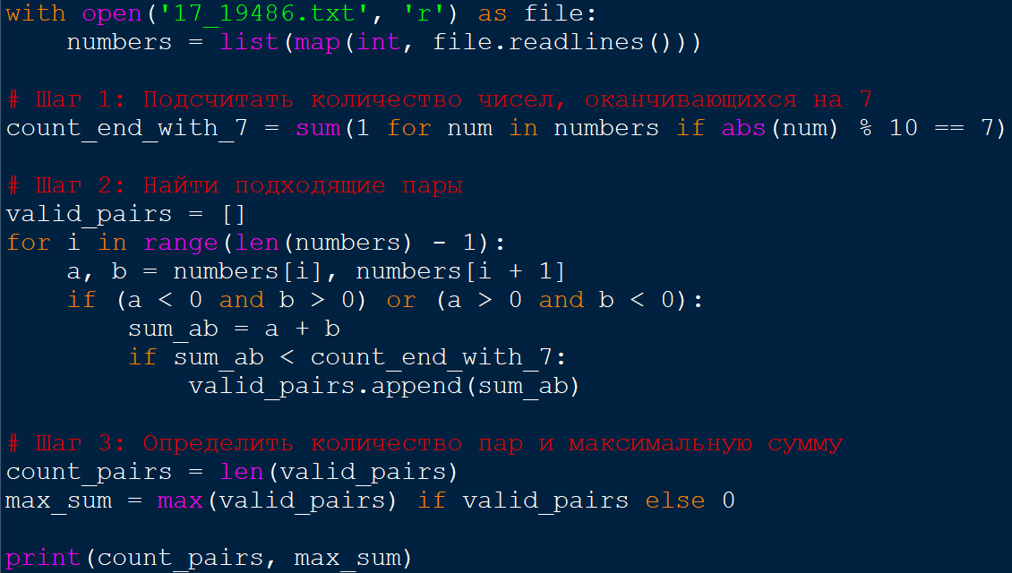 В файле содержится последовательность целых чисел. Её элементы могут принимать целые значения от –100 000 до 100 000 включительно. Определите количество пар последовательности, в которых одно из чисел отрицательно, а другое положительно, и при этом сумма чисел пары меньше количества чисел последовательности, оканчивающихся на 7. В ответе запишите количество найденных пар, затем максимальную из сумм элементов таких пар. В данной задаче под парой подразумевается два идущих подряд элемента последовательности. Не забывайте подписываться на канал! Таким образом вы помогаете выходу новых разборов! Решение: Если вам понравился разбор - можете поддержать автора с помощью функции "доната". Спасибо А также ставьте лайк, пишите комментарии. ЖМИ НА ССЫЛКУ СНИЗУ ДЛЯ НАВИГАЦИИ ПО РЕШЕНИЯМ Тут все разборы собраны воедино