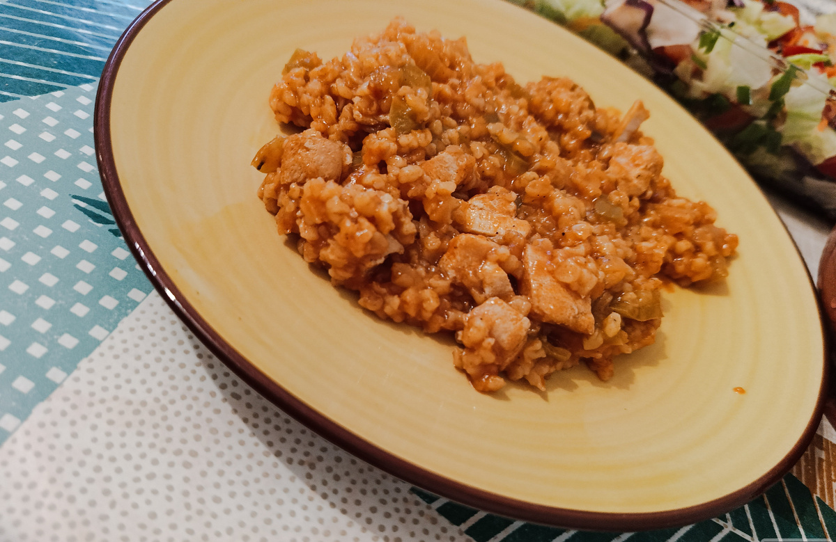 Очень часто такой плов можно встретить в турецком кафе или ресторане как гарнир. Частое блюдо на столе у любой турецкой хозяйки присутствует наряду с другими блюдами. Его можно совмещать с мясом, рыбой , супом даже к кебабами, чи кефте и закускам, наподобие кокореч. Готовится очень просто. Давайте приготовим. Ингредиенты плова: - 1 турецкий стакан булгура; - 1 луковица; - 2 шт. зелёного перца; - 1 ст.ложка томатной пасты без горки; - 1 долька чеснока; - 1/2 куриной грудки ; - 1.2 литра кипятка; - 1 ч.ложка черного молотого перца; - соль. Пошаговая инструкция: 1) Берём грудку куриную.Пока грудка охлаждённая мелко нарезаем на кубики. 2) Берём сковородку и без добавления масла обжариваем до небольшой корочки кубики куриные. 3) Достаем другую, глубокую большую сковородку. Добавляем 1.5 ст.ложки масла растительного. Разогреваем . Пока сковорода греется, нарезаем лук и перец мелко кубиками. 4) Обжариваем сначала лук. Через 5 минут под крышкой тушим. 5) Как только лук станет золо