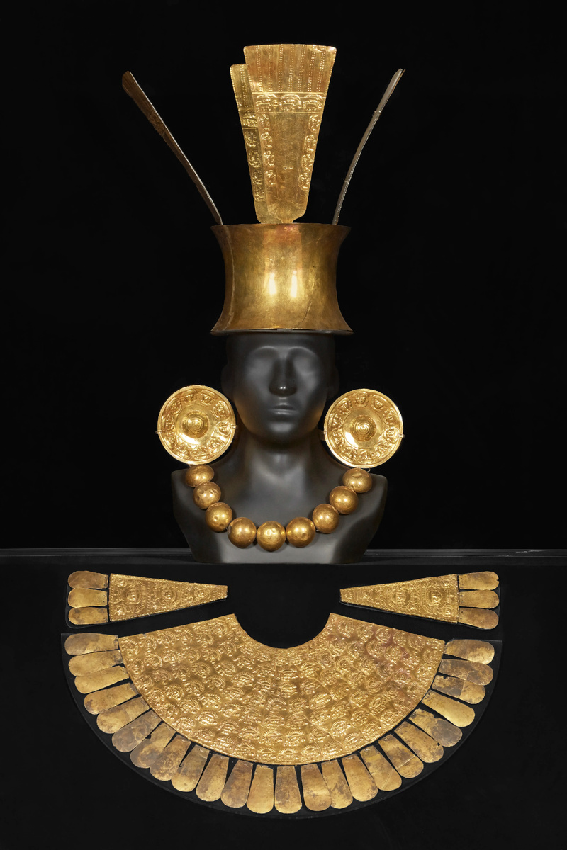 Именно их руками создан этот погребальный наряд, хранящийся ныне в Museo Oro del Perú. Он включает высокую цилиндрическую корону (льяуту) с навершием, вероятно, некогда украшенным яркими перьями тропических птиц. Широкий нагрудник-пектораль закрывал грудь и плечи.