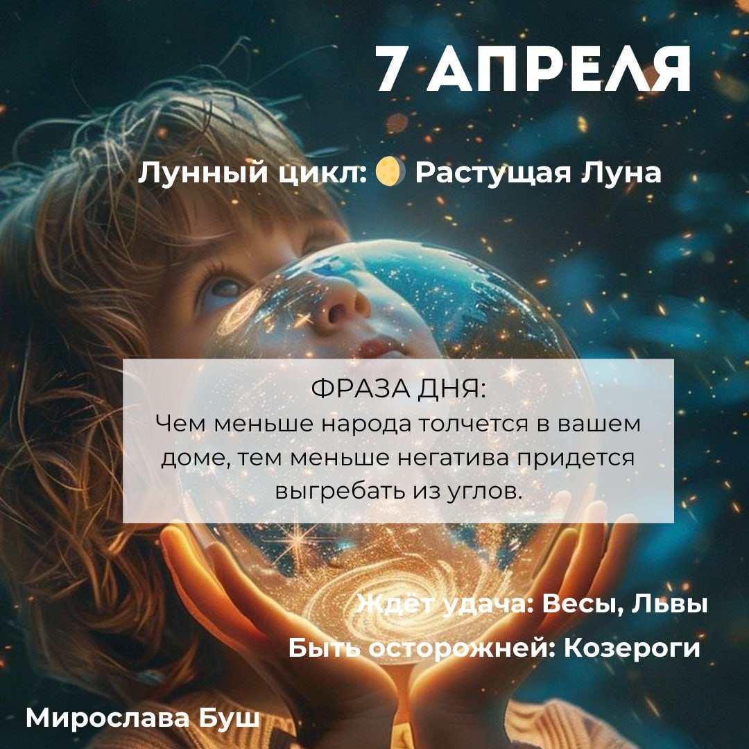 7 апреля РЕКОМЕНДАЦИИ: ❤️ У вас есть поддержка ближнего круга? Завтра она может вам понадобится. Понедельник - день тяжелый, и энергии завтра будут непростые. ⚡️ Погода меняется, могут быть перепады давления и головные боли. Дышите глубже, делайте паузы. 🤍 Если вы не будете пробовать что-то новое, то всё останется по старому. Какие тогда вам изменения к лучшему?