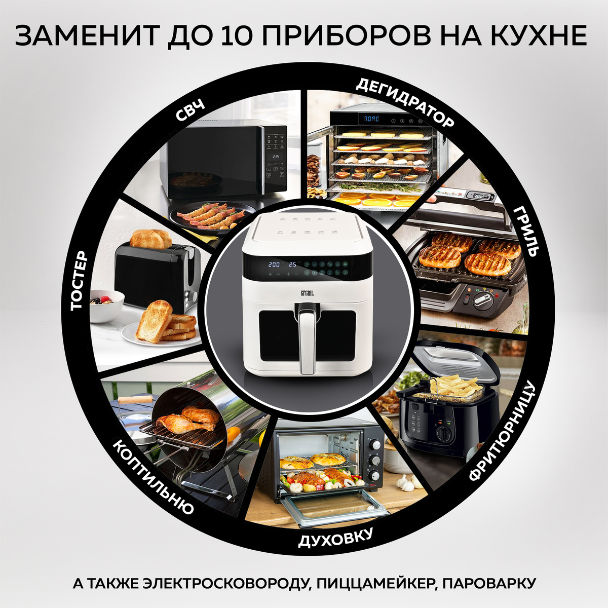 С каждым годом спрос на аэрогрили растет, что говорит о большой популярности этих устройств. Упрощение процесса приготовления, возможность порадовать себя и свою семью здоровой едой — это те преимущества, которые обусловливают выбор в пользу аэрогриля. Немного истории. Аэрогриль — это относительно новое устройство на рынке кухонной техники. Первые прототипы появились в начале 2000-х, однако настоящий бум наблюдается с 2010 года. Благодаря развитию технологий появляется возможность создавать каждую модель всё лучше. Сейчас аэрогриль становится символом современного подхода к кулинарии: многофункциональным, удобным и полезным. Аэрогриль GFGRIL GFA-6500 оснащен 10 автоматическими программами, которые облегчают процесс приготовления. Эти программы разработаны с учетом популярных рецептов и ваших потребностей. Вы можете выбрать режим для приготовления мяса или рыбы, картофеля фри или шашлыка, и даже пиццы или выпечки. А если вы хотите самостоятельно настроить нужное время и температуру, то