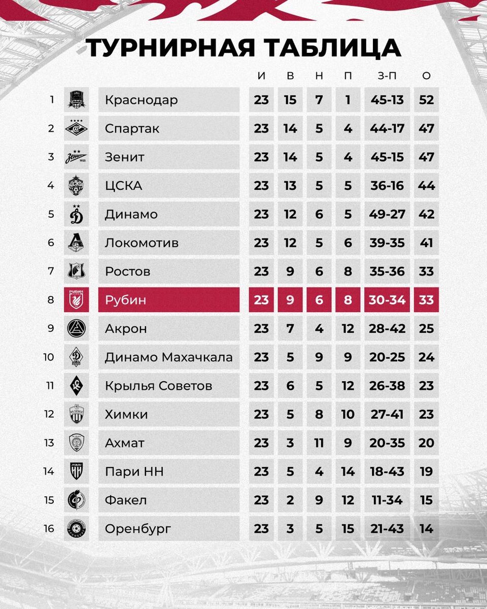 Фиксируем турнирную таблицу РПЛ после 2️⃣3️⃣ тура 📊
