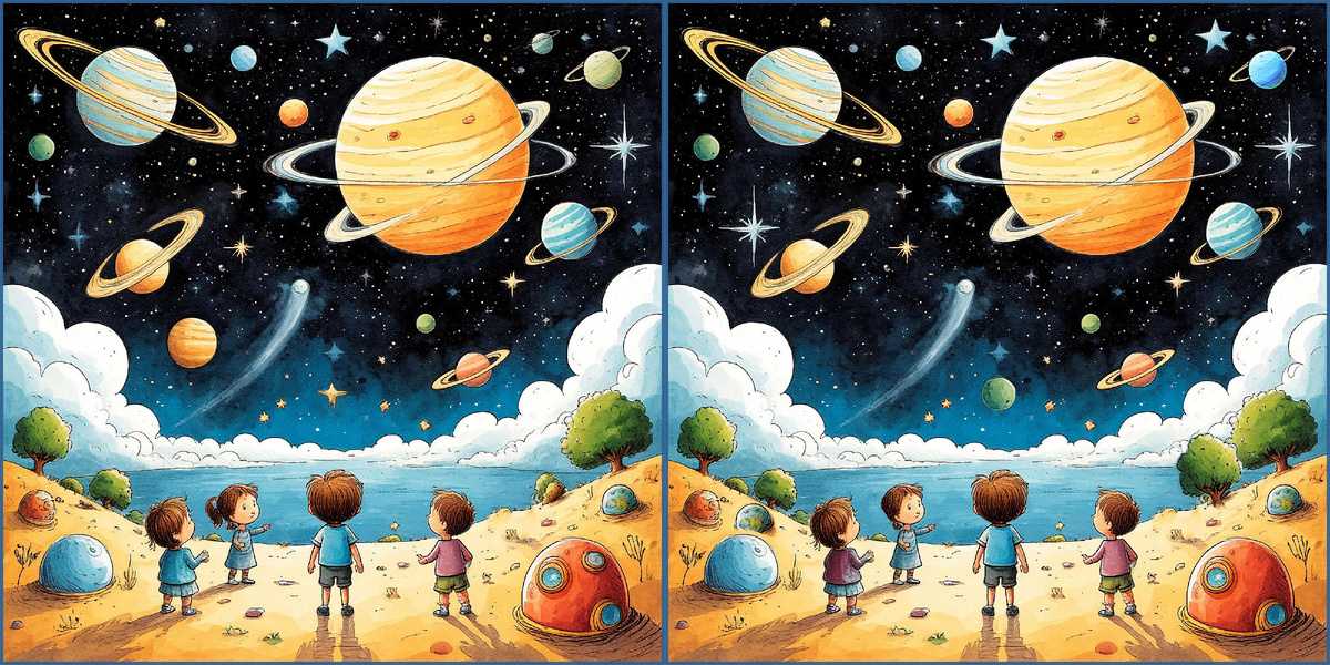 А отметим праздник мы, как всегда, по-своему: найдите 10 отличий между этими двумя картинками с детьми, которые с большим интересом рассматривают космос.