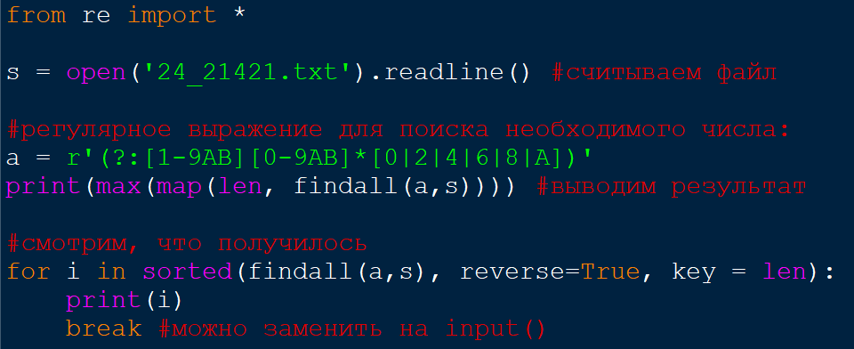 Текстовый файл состоит из символов, обозначающих десятичные цифры и заглавные буквы латинского алфавита. Определите в прилагаемом файле максимальное количество идущих подряд символов, которые могут представлять запись чётного числа в двенадцатеричной системе счисления. В этой записи отсутствуют незначащие (ведущие) нули. Для выполнения этого задания следует написать программу. Примечание. Цифры, числовое значение которых превышает 9, обозначены латинскими буквами, начиная с буквы A.