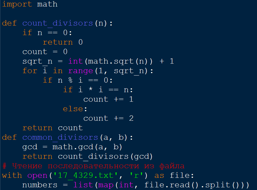 В файле содержится последовательность целых чисел. Элементы последовательности могут принимать целые значения от 1 до 1000 включительно. Определите количество пар последовательности, в которых оба числа имеют хотя бы 3 общих делителя с числом последовательности, имеющим максимальное количество делителей. В ответе запишите количество найденных пар, затем максимальное количество общих делителей между элементами таких пар. В данной задаче под парой подразумевается два идущих подряд элемента последовательности. Не забывайте подписываться на канал! Таким образом вы помогаете выходу новых разборов! Решение: Если вам понравился разбор - можете поддержать автора с помощью функции "доната". Спасибо А также ставьте лайк, пишите комментарии. ЖМИ НА ССЫЛКУ СНИЗУ ДЛЯ НАВИГАЦИИ ПО РЕШЕНИЯМ Тут все разборы собраны воедино