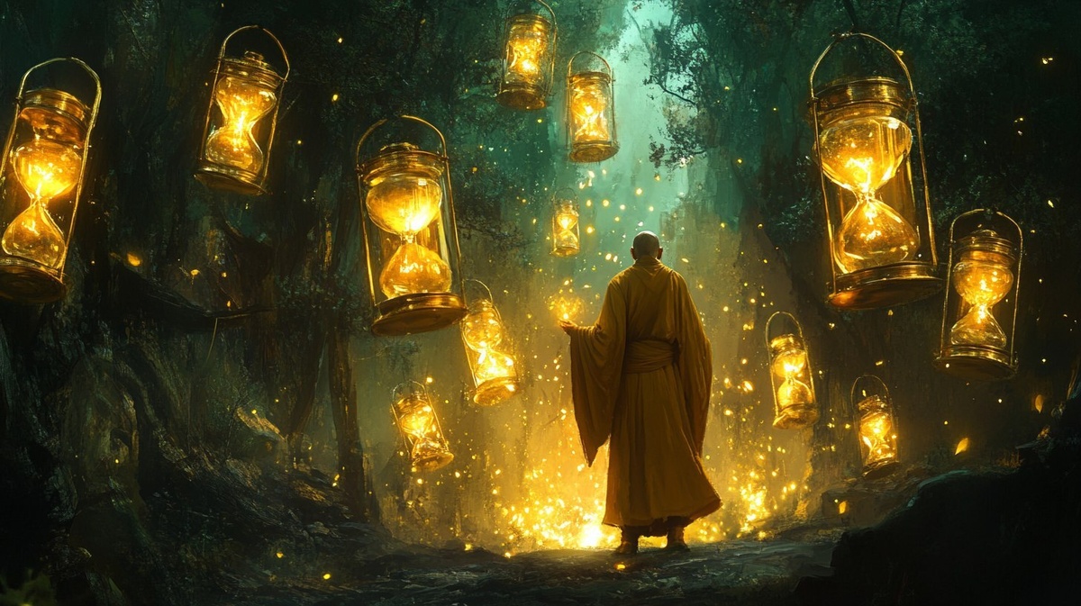 Создано на основе запроса: The monk surrounded by floating golden hourglasses in a dim forest, each one cracked open with light spilling