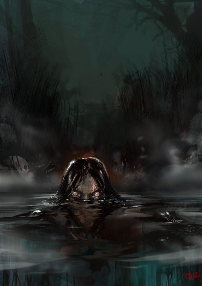 Она обернулась, и волосы зашевелились у нее на голове. Напротив нее стояло нечто отдаленно похожее на человека, да, у него было две руки и две ноги, туловище и голова. Тело было покрыто какими-то то ли истлевшими тряпками, то ли водорослями. С яйцообразной головы свисали черные слипшиеся длинные волосы. Кожа отливала каким-то бурым болотным оттенком. Существо имело большие ступни и длинные руки с крючковатыми пальцами.