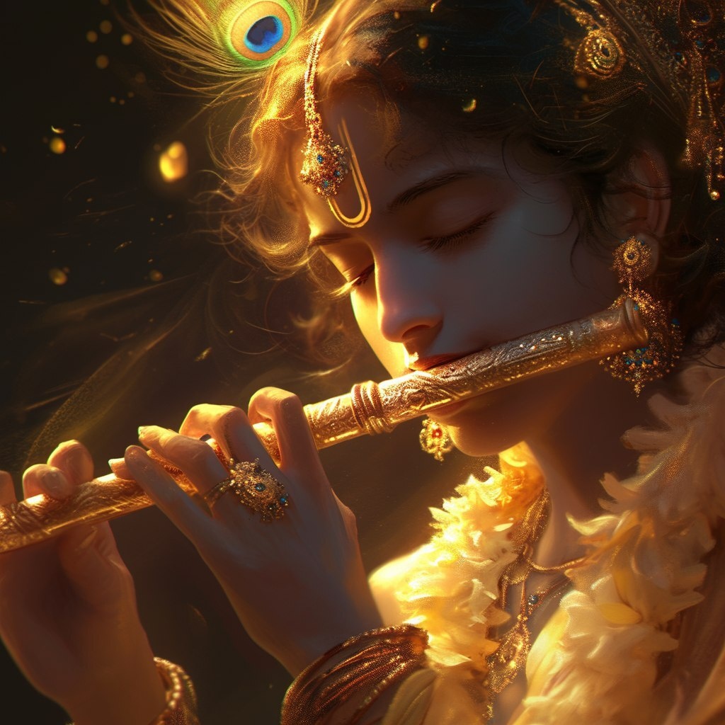 Создано на основе запроса: A divine, hyper-realistic depiction of Lord Krishna playing the flute, with serene expression and closed eyes, glowing in soft golden light. His skin is a smooth, stone-textured gray, adorned in intricate golden jewelry and a sparkling, jewel-studded yellow robe. A radiant peacock feather sits gracefully on his head, glowing softly. The background is black with shimmering golden particles floating like stardust, creating an ethereal, spiritual aura. Dramatic lighting emphasizes the divine glow around his face and flute. Ultra-detailed textures, cinematic lighting, 8K resolution, photorealistic, spiritual divine fantasy art, serene, majestic, peaceful expression, sacred presence. --- Автоперевод: Божественное, гиперреалистичное изображение Господа Кришны, играющего на флейте, с безмятежным выражением и закрытыми глазами, светящимися в мягком золотом свете. Круто выглядит? 🤔 https://dzen.ru/id/65c0c65c86e4f837c27b24d7 #ИИ #AI #нейросеть #midjourney #art