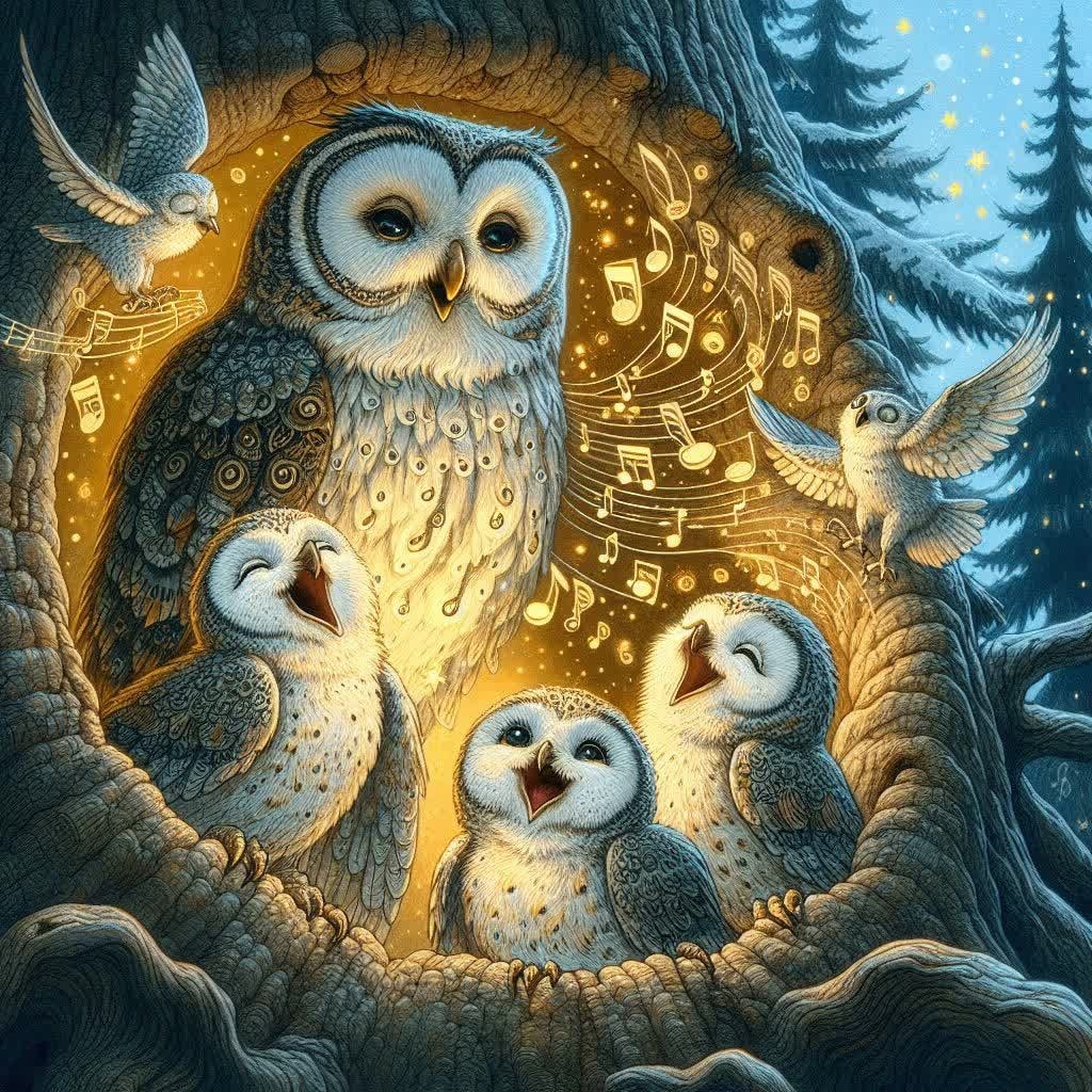 Пип и Грызь очень любили приключения, но больше всего на свете они ценили дружбу с семьёй сов, которые жили в старом дупле на вершине самой высокой сосны в лесу. Эти совы были особенные: они пели по ночам самые красивые песни во всём лесу. Однажды Пип и Грызь решили навестить Совиный Хор. "Наверное, у них есть новые песенки!" – воскликнул Пип, радостно подпрыгивая. Когда друзья добрались до сосны, они увидели, что вокруг дупла царит беспокойство. Старая сова, мудрый дедушка Совин, сидела на ветке с огорчённым видом. "Что случилось, дедушка Совин?" – спросил Грызь, обеспокоенно нахмурив брови. “Беда! – вздохнул старик. – Наш Волшебный Кристалл, который помогает нам петь самые красивые песни, пропал! Без него наши голоса становятся тихими и скучными.” Волшебный Кристалл был большим сияющим камнем "сердцем Совиного Хора", который висел в дупле и наполнял его волшебной энергией. "Мы вам поможем!" – храбро заявил Пип. "Грызь и я - лучшие детективы во всём лесу!" И друзья принялись