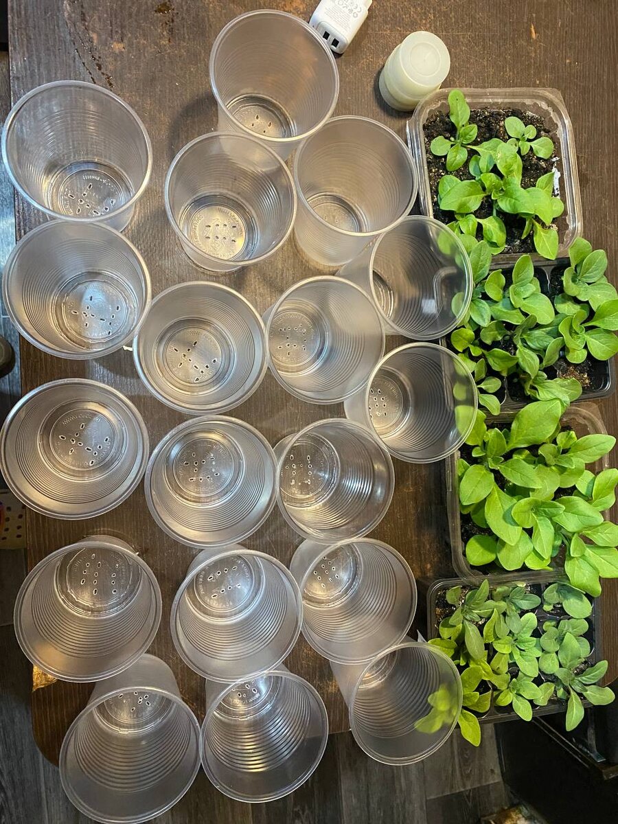 Это половина моих петуний. Где я просчиталась? Почему не остановила себя? Я насчитала у себя их 39 штук, от каждой будет, как минимум 1 черенок. Выкинуть я прищипнутое не могу себя заставить. Я же новичок, мне пока что всё жалко. Втыкаю в землю, а оно приживается, как на зло. Мне нужно, наверное, не более десяти - пятнадцати штук. А их будет примерно семьдесят. Больших. Тайдалов. Пересадила сегодня 17 штук, все такие холёные, крепкие. В этом году у меня не сгинуло ни одного кустика, все живут и колосятся к ужасу моему. Буду одаривать знакомых. Сил мне, неразумной.