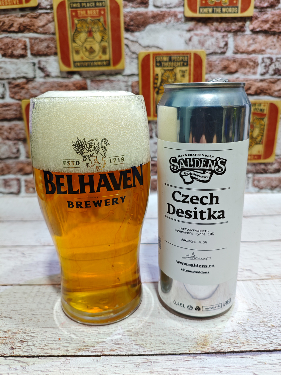 Собственно говоря чешская деситка от тульской пивоварни Salden's (ООО "Добрый Хмель"). ********************************************************************************** Плотность: 10%. Состав: вода, солод пивоваренный ячменный, хмель, дрожжи. Срок годности: 180 суток при температуре от +2℃ до +6℃. С даты розлива моей банки прошло 2 месяца. ********************************************************************************** Пена пышная и вполне стойкая. Аромат очень слабый: солодовый с едва заметной травянистостью и неким мучным оттенком. Карбонизация умеренная. Во вкусе солод и лёгкая травянистость с выраженным кисловатым привкусом. Кислинка не то, чтобы чрезмерная, но на конце глотка и послевкусии ощущается в некоторой степени неуместно. Плотности в целом хватает. Пиво пьётся легко, но с некоторыми сомнениями по поводу его "живости". Чуть сладковатое на послевкусии. Хмелевой выраженной горечи - не замечено. Крепость не чувствуется. Улавливаются отголоски жатецкого хмеля; он как будто