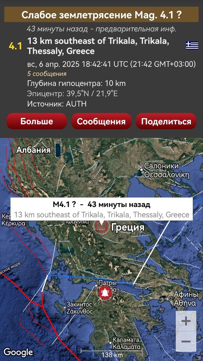 В ответ на пост После предупреждения от 5 апреля в Греции произошло 2 землетрясения М4+. Помимо дегазации возле одного из эпицентров (фото 3) наблюдалась линейная облачная структура в Ионическом море (фото 4). Наблюдаем за ситуацией далее, т.к. возможно продолжение сейсмики уровня М5-6+. ===== After the warning, 2 M4+ earthquakes occurred in Greece. In addition to degassing (photo 3), a linear cloud structure was observed in the Ionian Sea (Photo 4). We are monitoring the situation further, as it is possible that the seismic activity at the M5-6+ level will continue.