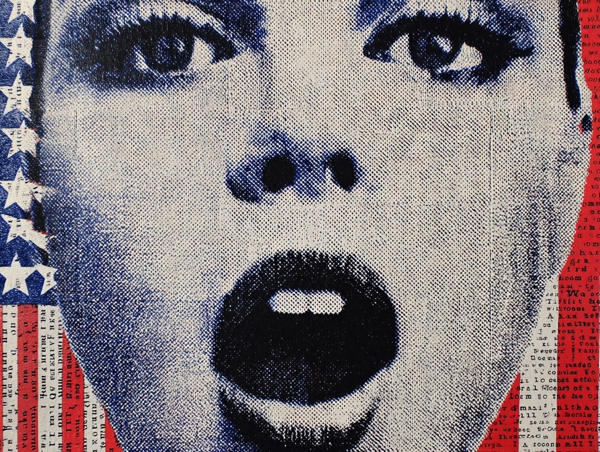 Создано на основе запроса: a political a conversation through art, red, white, and blue, stars and stripes, I am woman hear me roar