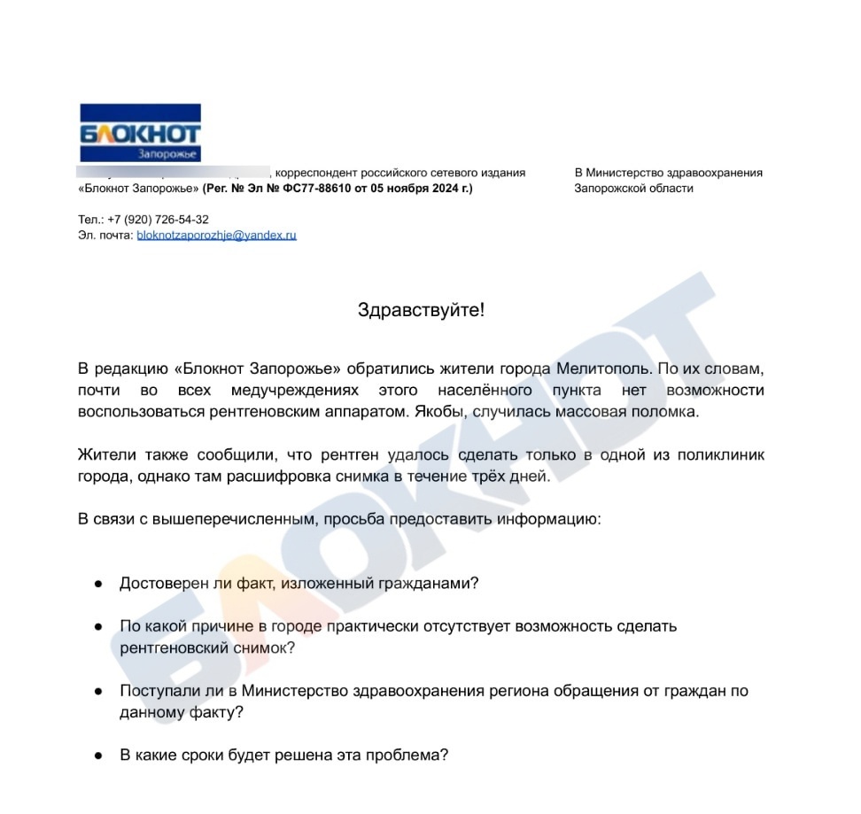 Не так давно в редакцию «Блокнот Запорожье» обратились возмущённые жители города Мелитополь. По их словам, почти во всех медучреждениях этого населённого пункта нет возможности воспользоваться рентгеновским аппаратом. Якобы, случилась массовая поломка именно в сезон гриппа.
