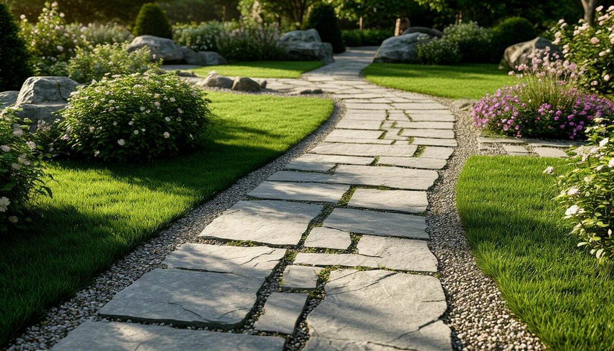 Сочетание разных материалов (камень + гравий, дерево + бетон) делает тропинки интереснее.