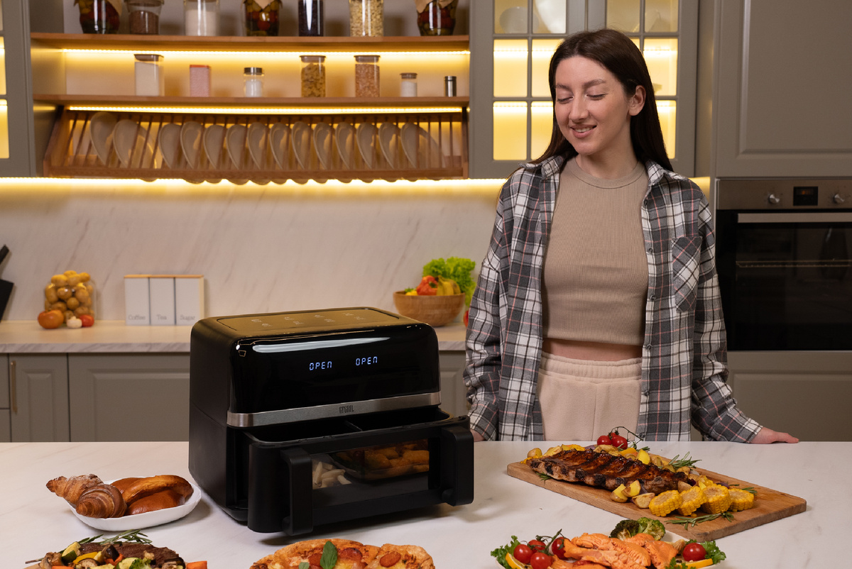 Семейный обед, ужин с друзьями или просто возможность побаловать себя или свою семью вкусными блюдами – сколько поводов для приятных моментов! И при этом очень важно, чтобы все было еще и полезно. Расскажем вам о незаменимом и современном кухонном приборе - Аэрогриль GFGRIL GFA-9000, который может справиться с важными задачами. Блюда будут удивлять своим вкусом и сохранять все свои полезные качества. Давайте подробнее рассмотрим, что делает аэрогриль таким привлекательным и как он может улучшить кулинарную жизнь. Одной из ключевых особенностей данного аэрогриля является наличие двух чаш, что позволяет одновременно готовить два разных блюда. Например, вы можете запечь мясо в одной чаше и овощи на гарнир во второй. Так вы сэкономите время в два раза, ведь не придется готовить все порции по отдельности. А если в меню, предположим, целый цыпленок или рагу, где много ингредиентов, то перегородка между двумя чашами легко снимается, увеличивая пространство для более габаритных блюд. Общий объ