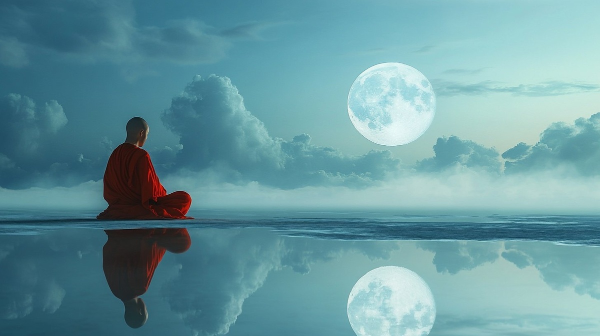 Создано на основе запроса: The second monk, in deep meditation, with the reflection of the moon on the still water, symbolizing peace found