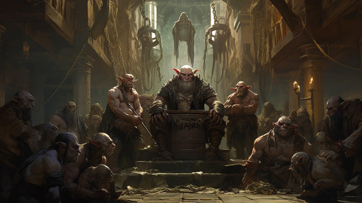 Создано на основе запроса: a grim goblin ritual scene inside a ramshackle underground court, a massive and muscular goblin king sits above