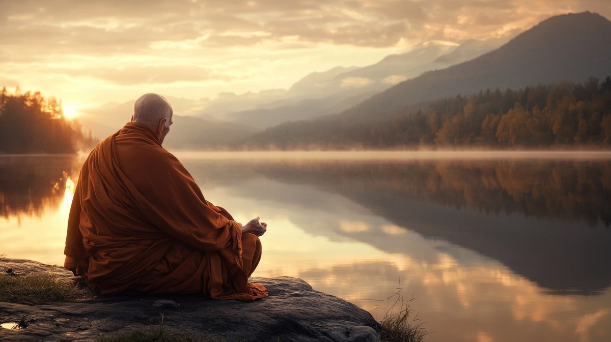 Создано на основе запроса: An elderly monk contemplating by the edge of a calm lake at sunset, the reflection in the water representing the