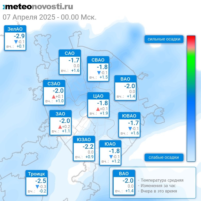 В 0:00 в Москве было от -3.1°C до -1.3°C, средняя температура -2°C #погода #Москва #весна #температура #7апреля #понедельник