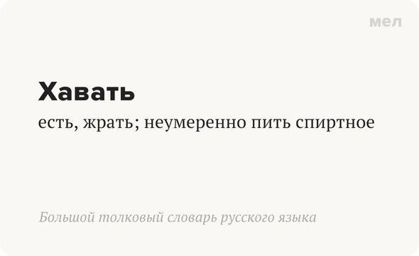 У этого жаргонного слова есть отчетливая негативная коннотация, и звучит оно очень неприятно, однако уже несколько поколений российской молодежи продолжают использовать его в повседневной речи. Разбираемся, что это слово значит на самом деле и откуда оно произошло. Начнем с самого авторитетного источника — «Большого толкового словаря», который фиксирует его значение как «есть, жрать; неумеренно пить спиртное» (про спиртное удивительно) и приводит необычную и довольно сомнительную версию происхождения: «В молодежном жаргоне произведено от англ. have — „иметь, обладать“». Второй источник — «Словарь русского арго» В. С. Елистратова, который еще больше расширяет привычное значение: В статье также фиксируются слова, которые могут быть связаны с глаголом «хавать»: По версии составителя, глагол «хавать» происходит от цыганского слова te xas — «есть, кушать». Третий источник — словарь «Язык Одессы. Слова и фразы». Он в целом повторяет версию «Словаря русского арго»: Но украшает ее симпатичным