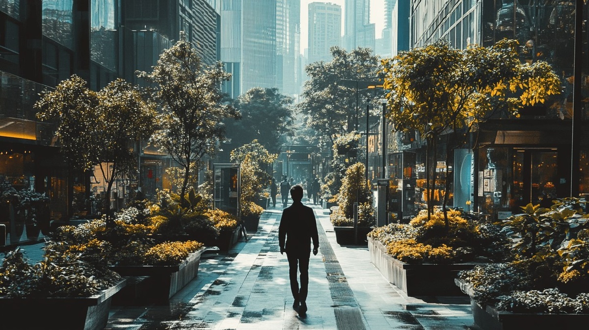 Создано на основе запроса: A symbolic image of a bustling city street transforming into a peaceful garden, the entrepreneur walking through