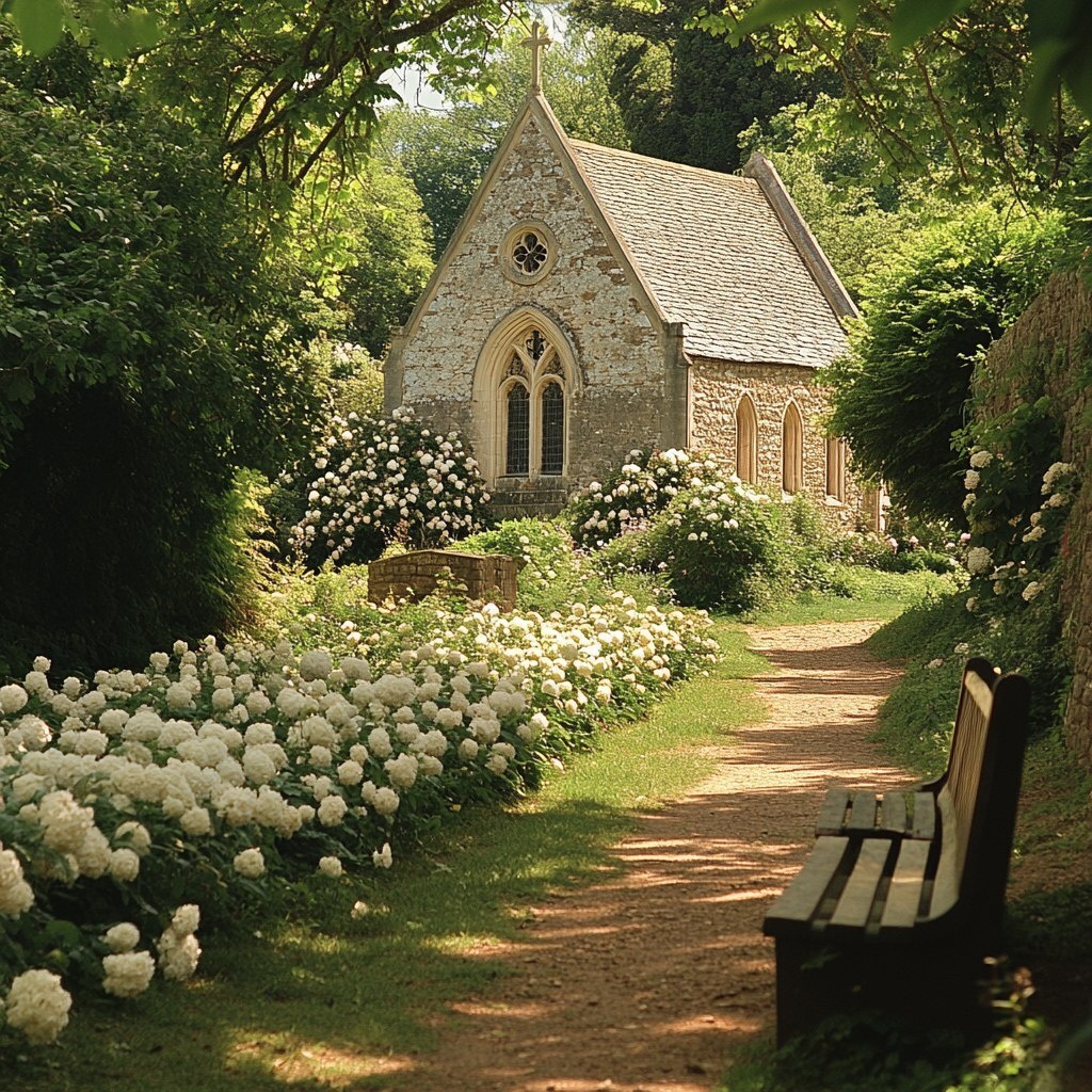 Создано на основе запроса: beautiful church garden with whiite flowers and a cute little bench with an old stone church in the background