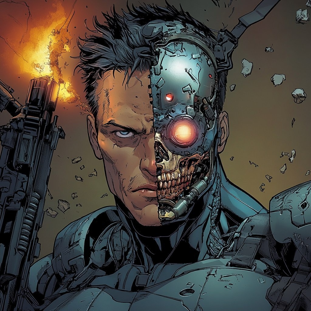 Создано на основе запроса: Comic book style of Jim Lee. Cyborg super soldier named X-Ray. Half of his face is a metal skull. He carries a laser pistol. --- Автоперевод: Комикс стиль Джима Ли. Как тебе этот вариант? 🤔 https://dzen.ru/id/65c0c65c86e4f837c27b24d7 #ИИ #AI #нейросеть #midjourney #art