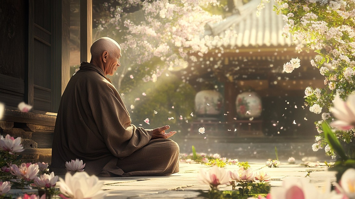 Создано на основе запроса: An elderly monk meditating peacefully in a tranquil, serene garden, surrounded by blooming flowers and gentle