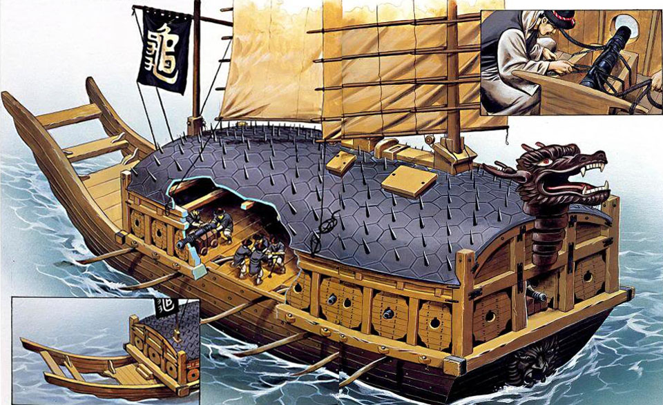 Идея защитить корабль металлом действительно «витала в воздухе» в XVI веке, и первыми в Восточной Азии ее попытались реализовать именно японцы. Еще в 1578 году могущественный даймё Ода Нобунага, стремившийся объединить Японию и боровшийся с непокорными феодалами и пиратскими флотилиями, приказал построить несколько больших кораблей, известных как тэккосэн («железные корабли»). По описаниям, это были внушительные суда (около 22 метров в длину и 13 в ширину), чья надводная часть была частично обшита железными листами. Вооружены они были крупнокалиберными фитильными мушкетами («стенными ружьями»), способными пробивать борта обычных деревянных судов. Эти корабли сыграли свою роль в борьбе Нобунаги с пиратским флотом клана Мори, но имели серьезные технические недостатки: были медлительны, неповоротливы, а частичная броня не спасала от абордажа (один из них был захвачен и перевернулся). Тем не менее, сам факт их существования говорит о том, что идея металлической защиты на море была знакома японцам.