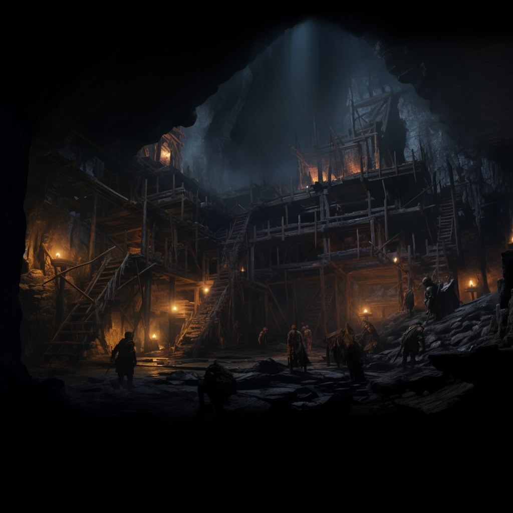 Создано на основе запроса: fantasy underground mine filled with wooden scaffolding, ropes, and torchlight, a group of human workers wearing medieval tunics and cloth wraps use tools to shape the stone walls, in the distance, a goblin figure stands on a raised platform observing the activity, the environment is smoky and dimly lit, with carved stone textures and dust in the air, cinematic atmosphere, inspired by Tolkien's Middle-earth, highly detailed, no modern elements --- Автоперевод: Фэнтезийная подземная шахта, наполненная деревянными лесами, веревками и фонариком, группой человеческих рабочих, носящих средневековые туники и тканевые обертывания, используют инструменты для формирования каменных стен, на расстоянии, фигура гоблина стоит на приподнятой платформе, наблюдающей за активностью, окружающая среда-это дымная и тускло освещенная, с натраненным камнем и пыль Отлично выглядит? 🤔 https://dzen.ru/id/65c0c65c86e4f837c27b24d7 #ИИ #AI #нейросеть #midjourney #art