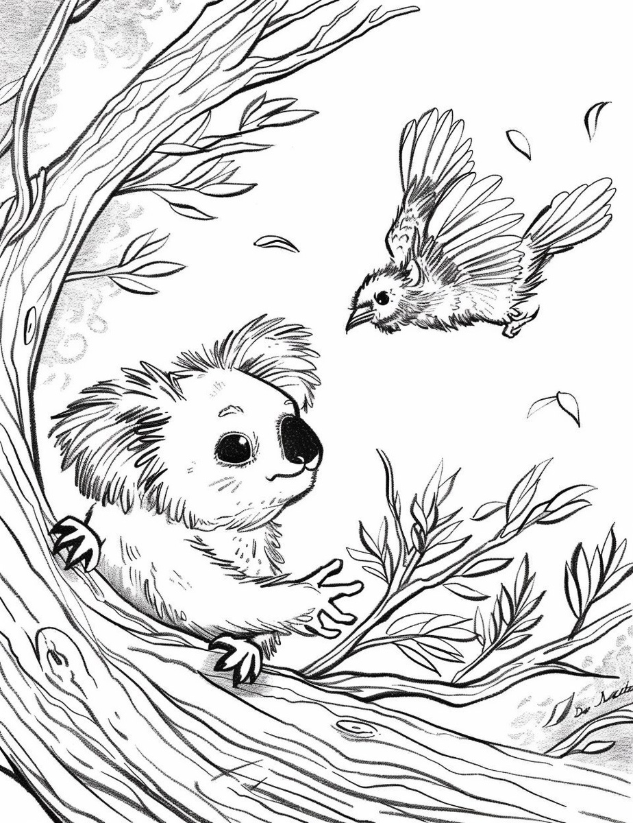 Создано на основе запроса: A simple black-and-white coloring page for toddlers (3 years old) showing a cute cartoon koala waking up in a tree. A koala looking up at a flying bird. One bird, thick lines, no trees or extra background. --- Автоперевод: Простая черно-белая раскраска для малышей (3 года), показывающая милую мультипликационную коалу, просыпалась на дереве. Необычно получилось? 🤔 https://dzen.ru/id/65c0c65c86e4f837c27b24d7 #ИИ #AI #нейросеть #midjourney #art