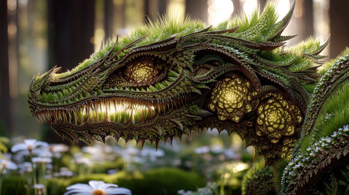 Автоперевод: Гипер реалистичная фотография пирамиды, ДНК Flytrap Venus, острые зубы, бегущий в легком солнечном лесу 16K